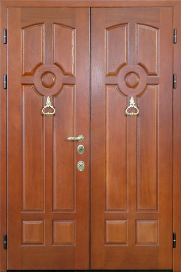 Двустворчатая металлическая дверь со стукалками-молотками — выбор тех, кто ищет надёжную и эстетичную входную дверь. МДФ-панели позволяют реализовать индивидуальные дизайнерские решения при сохранении технических характеристик двери. Подчёркивают архитектурный стиль здания. Дизайн подойдет для тех, кто ценит натуральные материалы.